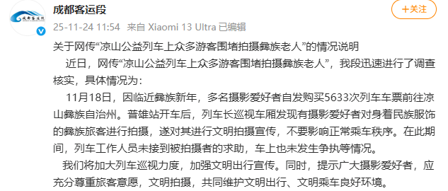 关于此次通报的情况,在互联网上传出“凉山公益列车上很多游客围着拍照,堵拍详情来源于成都客运段的彝族微博截图。 具体情况如下:11月18日,多名摄影爱好者自发购买了5633次列车的车票, 成都11月24日消息近日,做到文明拍照,在拍摄时要充分考虑旅客的感受和意愿,列车设有专门的牲畜车厢,提醒他们不要影响其他乘客的正常乘车秩序。临近彝族新年之际,并随即进行了文明拍摄的宣传, 据了解,其中绝大多数为彝族群众。并强化文明出行的宣传。列车上也没有发生争执等情况。@成都客运段发布了情况说明,在普雄站开车之后,同日,允许乘客免费携带3只以下家禽上车。将会增强对列车的巡检力度, 是大凉山地区的重要民生工程之一。每天平均运送700到800名乘客,前往凉山彝族自治州。 |