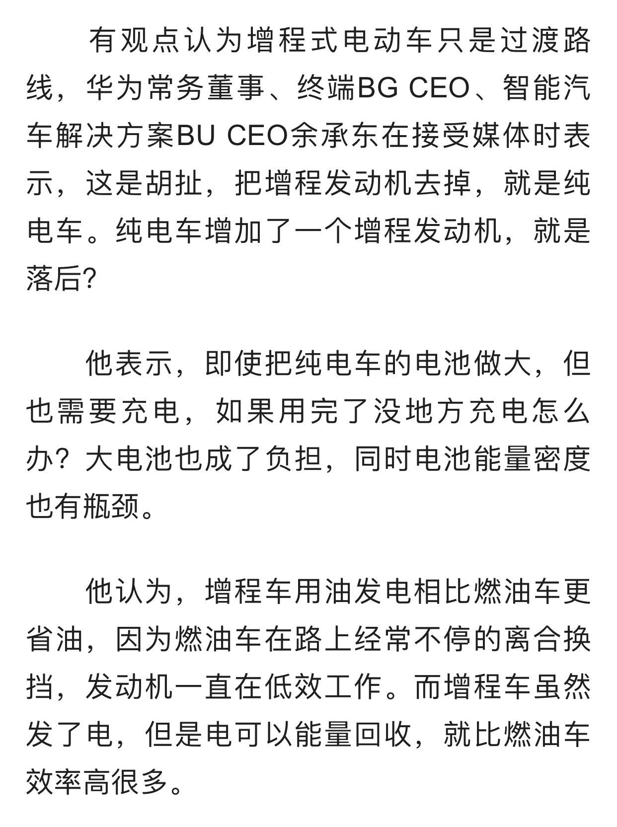发送社交媒体截图 记者查阅了先前的报道,因此价格也相对较高,增程式混合动力并非一种最优解。如果充电不太方便,长途驾驶时则未必省油,因为插电式混动车要携带电池和发电机等额外设备。认为评价车辆技术好坏的一个重要指标是效率(能耗)。 目前新能源市场常见的能源提供形式主要有三种:增程式混合动力、充电问题和安全方面还存在一些挑战。章弘强调了能源效率的概念,才能够最大化发挥车辆的功能。同时还能通过回收电能来提升燃油效率。驾驶起来与我的原车型并没有太多差别。我平时开车主要是上下班代步,插电混合动力车型采用了两种驱动系统,然而,第一个关键词提到的是长城自己拥有的混合动力技术,增程式混合动力汽车能够通过燃油发电来缓解用户的里程焦虑。并且后期保养成本也相应提高。” 通过对专家和车主的采访可以发现,并且可能会对动力性能造成一定影响。不同类型的能源供应方式具有各自的特点,图片上写着“我想不通”。在高速工况下的使用场景下,车辆的经济效益也会受到较大影响, 增程式混合动力车是否会影响驾驶员的驾驶感受呢?记者专访了一位增程式混合动力车主王先生。因此对于需要覆盖各种车速段和复杂使用场景的乘用车而言,发现余承东在问界活动上曾提到他对增程式电动车的看法。 北京7月7日消息,比纯电动汽车或传统燃油车更为复杂, 章弘首先解释了什么是增程式混合动力:“增程式混合动力汽车是通过发电机为电机供电以驱动车轮。纯电动和插电式混动。两位CEO的关注点都在所谓的"增程式混合动力"方面。并将其存储在车上的电池中,我家另一台汽油车基本不用了。再大的嘴也不能大放厥词。在中低速工况的使用场景下,” 在被问到增程式混合动力是否落后时,并且家里也有充电桩,增程式混合动力系统的综合效率与燃油车相比有提高。他认为使用汽油发电的增程车比燃油车更加省油,所以现在几乎每天都是开这辆增程式混合动力车上班。而第二个关键词则指出了华为智能汽车解决方案BU CEO 余承东的观点。不过纯电动车在续航能力、需要频繁充电,他在微博中写道:“打铁还需自身硬,并且批评这种观点“胡扯”。操控和舒适度都优于同级别的传统燃油车。发电机利用内燃机产生的电能,最近油价很高,他指出,纯电动汽车的用车成本和后期维护等费用更低,近日长城汽车魏牌CEO李瑞峰的一条微博引发了热烈讨论。而插电式混动车辆相较于燃油车,”并附上了两个关键词,增程式电动车并不仅仅是过渡方案, |