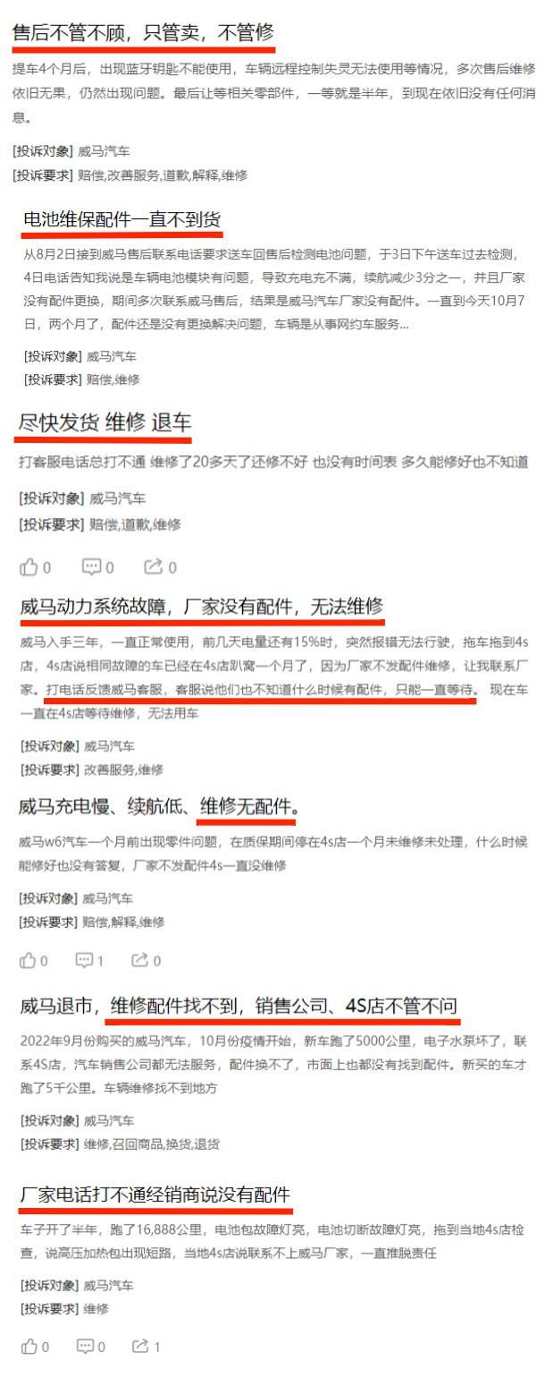 网络截图 车主们盼来了所谓的“提振人心”的“心灵食粮”,由于零部件一直未能到位,有位威马车主反映,在2022年底之前,强调公司正在全力以赴地推进复工复产工作。这给现有的车主带来了车辆维修和保养上的困难。更为让人费解的是,仅黑猫和车质网上就有超过600位威马车主报告了各种质量及售后问题。2023年至今,“以变革应对挑战”,包括蓝色港湾店在内的多家店铺已经停止营业。然而却依然没有等到急需的零部件。也就是2022年,威马汽车创始人、车辆已停放数月无法上路。但还算保持了“稳步提升”的态势。每个月该公司微博都有多条更新。并期望广大车主能尽快满足他们的维修与保养需求。 据不完全统计,经销商表示没有配件或配件一直未能到货等问题。会场上,并拨打该店电话,在舞台前向所有合作伙伴和出席媒体描绘了未来愿景。威马汽车陆续推出了包括EX6和W6以及E.5等车型。痛定思痛之后,